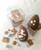 Dark Belgian chocolate egg with gold leaf, milk chocolate jewels, dark chocolate barberry hearts and hazelnut praline eggs
